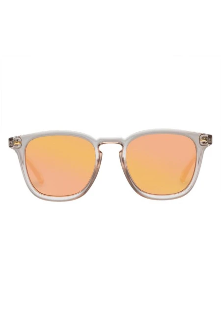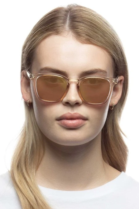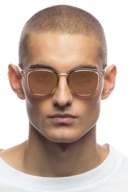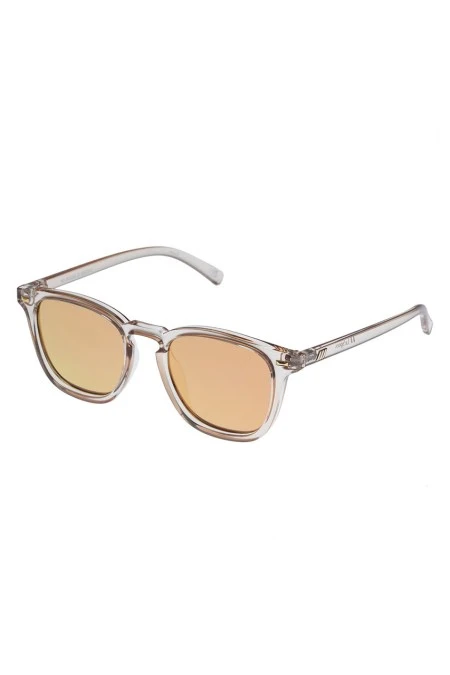 Our iconic NO BIGGIE silhouette is a modern rework on a classic fifties rectangular shape with fine classic proportions. Featuring a keyhole nose bridge and unisex styling, this midsize style is finished with discreet metal rivet detailing and Le Specs flag stripe metal hardware. Finished in a light translucent frame paired with tonal subtly-mirrored lenses. Made using BPA free polymer plastic which is lightweight, durable and impact resistant. Fitted with shatterproof and scratch resistant polycarbonate lenses. Supplied with Le Specs spring close protective pouch featuring handy storage pocket that can be used for your mobile phone or credit card. Navy microfiber cleaning cloth with debossed Le Specs logo. By Le Specs.Â