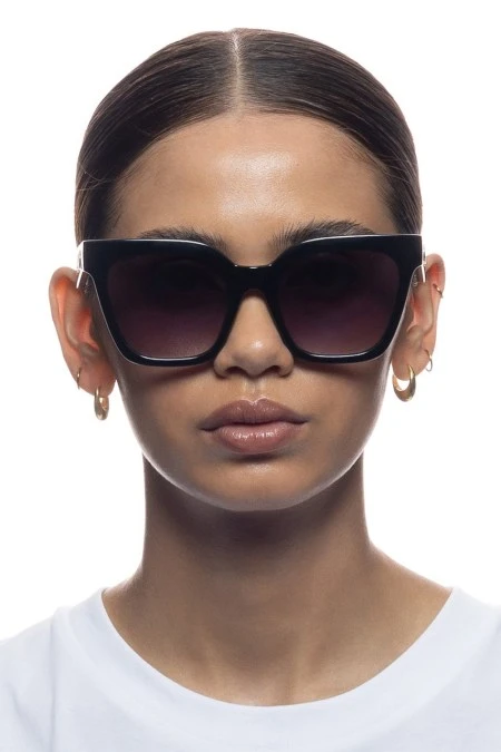 Designed as an everyday classic, our STAR GLOW sunglasses are feminine and chic. Offering an oversized fit, this cat-eye silhouette features a wider fit suitable for all face shapes and sizes, and is adorned with luxurious chain link hardware on both temples. Finished in classic black with dark lenses for an everyday look. Made using BPA free polymer plastic which is lightweight, durable and impact resistant. Fitted with shatterproof and scratch resistant polycarbonate lenses. By Les Specs.Â
