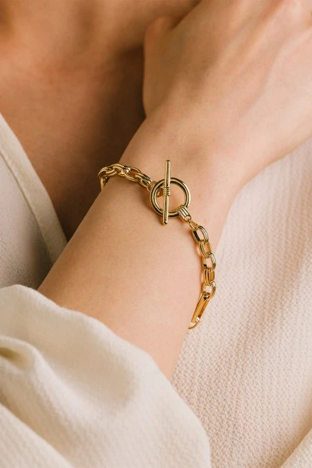 A sophisticated bracelet with mixed links and a toggle closure. Throw this on and achieve instant outfit elevation. By Lover’s Tempo.