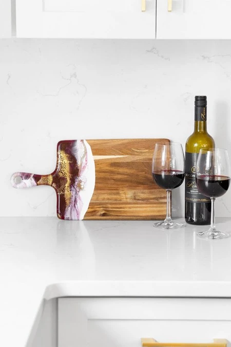 These pieces blend gorgeous Acacia hardwood and an eco-friendly resin to create a one-of-a-kind piece of serveware for your home. These cheese boards are perfect for serving a group of 2-4 people. The perfect gift for a house-warmings, weddings or maybe just a treat for yourself ? Serve your favorite snacks for a girls night in, a date night with your spouse or for a get together with friends. We can only imagine the beautiful spreads you’ll create with your new cheeseboard! Our cheese boards and serving trays now come in beautiful Lynn & Liana black gift boxes to make your gift presentation even more spectacular! By Lynn & Liana.