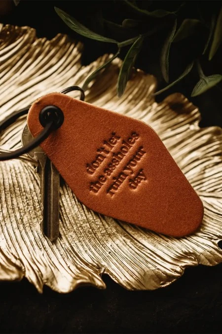 Genuine Leather Motel Keychain Stamped With “Don’t Let The Assholes Ruin Your Day”. By Misfit.