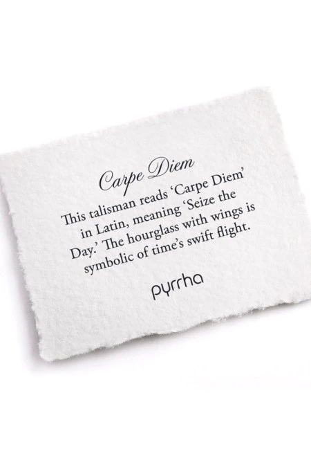 This talisman reads ‘Carpe Diem’ in Latin, meaning ‘Seize the Day.’ The hourglass with wings is symbolic of time’s swift flight. As a certified carbon-neutral B Corp, we’re committed to environmental responsibility — our jewelry is sustainably handcrafted with 100% recycled metals in our Vancouver studio using antique wax seals and imagery from the Victorian era. Member of 1% for the Planet, Ethical Metalsmiths, and the Responsible Jewellery Council. By Pyrrha.