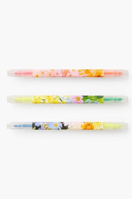 Accent your school notes, to-do list, or planner with our set of three double-sided highlighters. They are wrapped in our illustrated floral designs and feature five neon ink colors. By Rifle Paper Co.