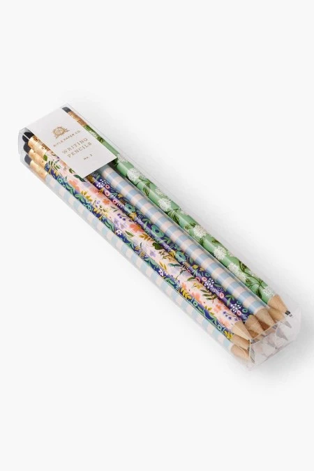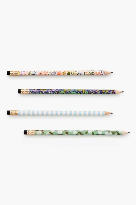 Bring pastel florals and stripes to your morning crosswords or pop quizzes. Our 12-piece, pre-sharpened writing pencil set includes three of each design with black erasers. By Rifle Paper Co.