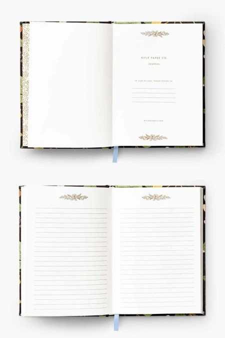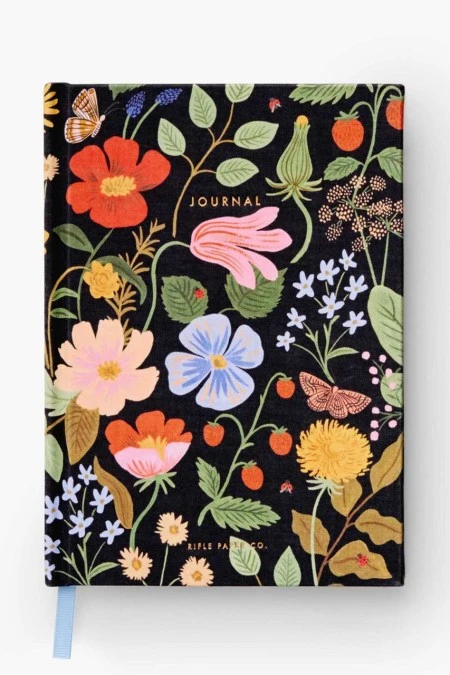 Let our Strawberry Fields Fabric Journal inspire your storytelling with each turn of the page. It features a hard cover wrapped in printed book cloth, lay-flat binding, a coordinating bookmark, and gold foil accents. By Rifle Paper Co.