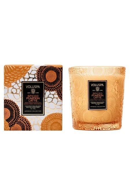 Voluspas unique coconut wax blend is hand-poured into a 9 oz. embossed glass jar with decorative gift box. The single wick allows you to enjoy fragrance throw for 60 hours. Our candles are hand-poured in the United States and feature our proprietary, clean-burning coconut wax blend and 100% natural wicks. Our products are free of phthalates, pesticides, parabens and sulfates and are never tested on animals. Up-cycle this best seller into a keepsake after the last burn. Invite the Fall season in with Voluspa’s Spiced Pumpkin Latte collection. Like cozying up with your favorite drink, this collection evokes a familiar yet refined scent. By Voluspa.