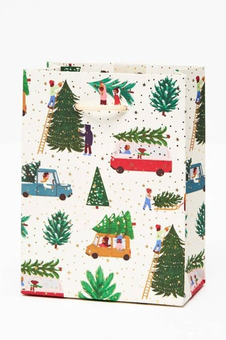 This Christmas tree lot gift bag is ideal for the festive season! It comes in a small size, measuring 4.5” x 2.5” x 6”. You can pair it with our charming bows, tags, and tissue paper to add a touch of elegance to your gift. By Waste Not Paper.